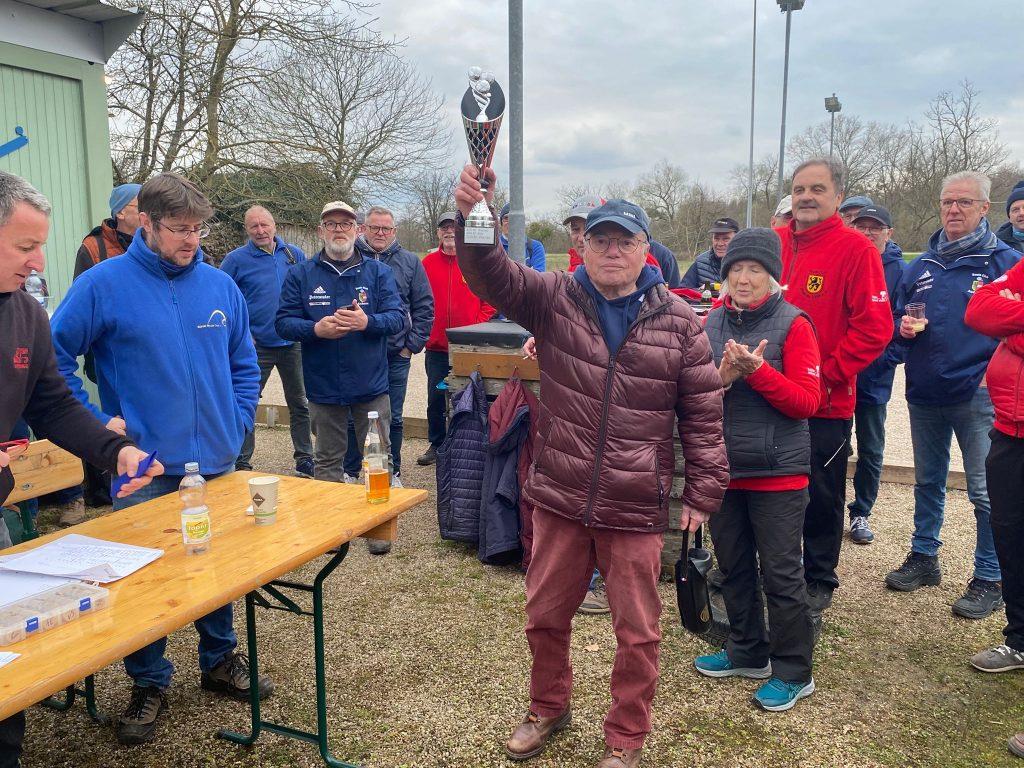 Der mit vier Siegen aus vier Begegnungen tagesbeste Acherner Karl-Heinz Kastl nimmt den begehrten Pokal aus den Händern der Turnierleitung entgegen. Auch in der Gesamtwertung ist mit Antonio Aulicino (10 Siege aus 12 Begegnungen) ein Acherner ganz oben auf dem Treppchen dabei.