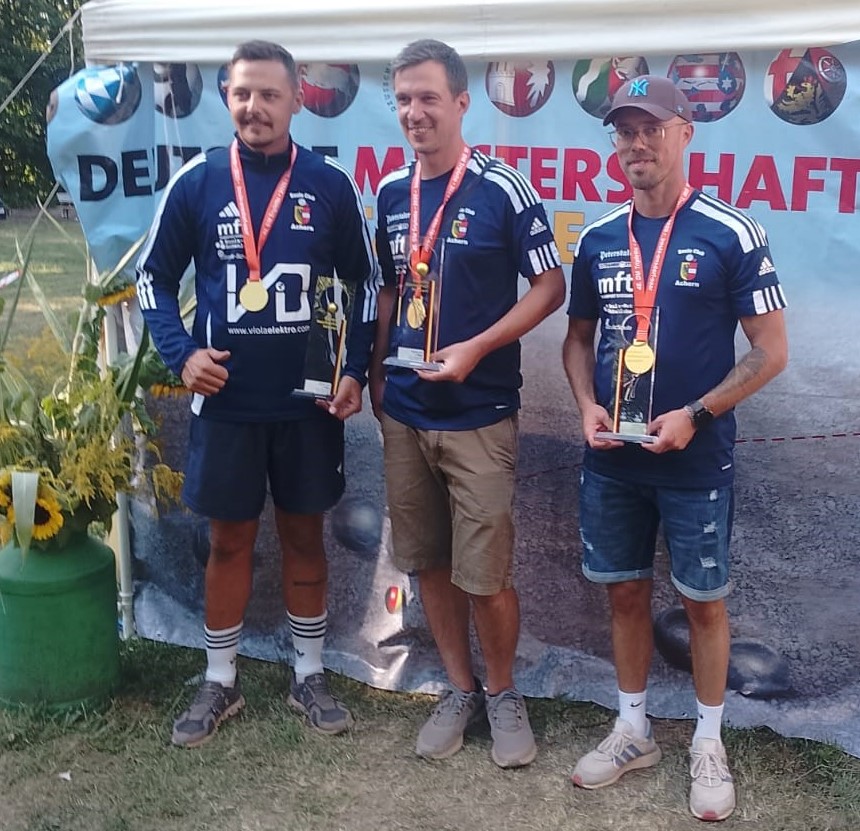 Am 23. und 24. August fand im saarländischen Ensdorf die Deutsche Meisterschaft im Triplette 2025 statt. Der BC Achern hatte mehrere Eisen im Feuer. Als BaWü04 gingen Juan Lago, Philipp Schatz und André Skiba an den Start. Für die reine Acherner Formation war im 1/16-Finale Endstation. Bei BaWü06 startete Robin Stentenbach in den Acherner Farben zusammen mit Matthias Laukart und Sönke Backens als Titelverteidiger und einer der Titelaspiranten. Die drei erwischten eine anspruchsvolle Auslosung und mussten sich dann in ihrem über zwei Stunden dauernden Viertelfinale BaWü12 (Moritz Rosik, Fabian Vonberg, Sascha Wagner) mit einem umkämpften 10:13 geschlagen geben. Auf ihrem Weg ins Viertelfinale räumten sie allerdings vorher noch mit Fabienne Baier eine weitere Achernerin kurz und schmerzhaft mit einem trockenen Fanny ab (1/32-Finale). Patrick und Thierry Béton, ein weiteres Mal mit Sascha Löh formiert, schafften es ebenfalls bis ins 1/16-Finale, hatten da aber gegen ein Jeveraner Team mit 7:13 das Nachsehen.